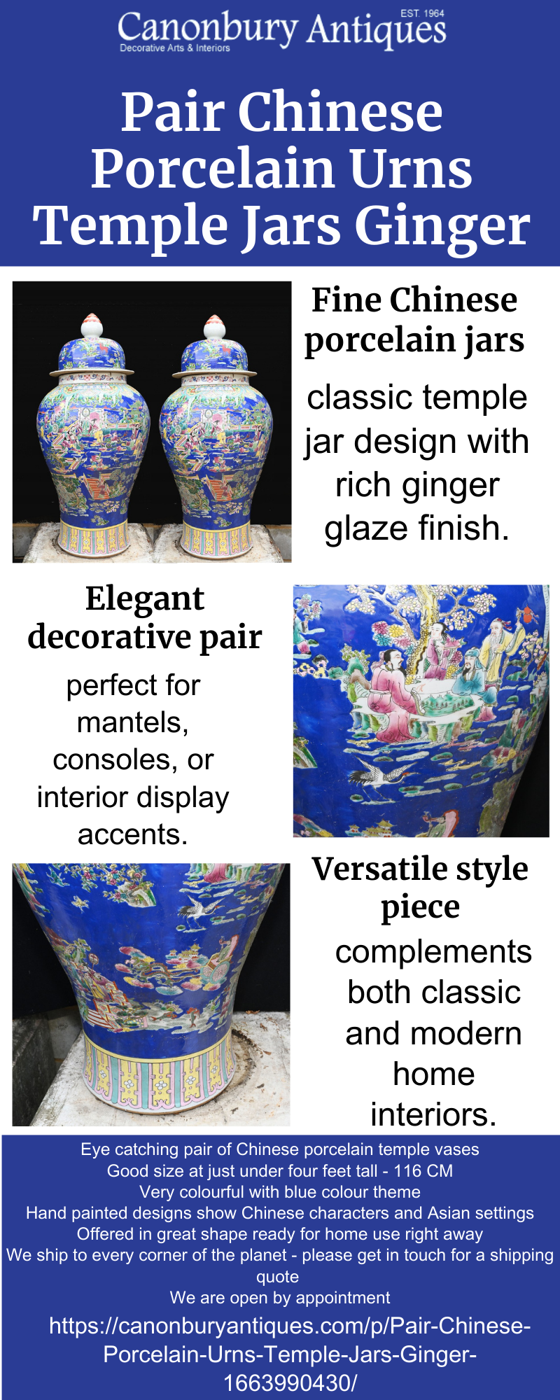 Pair Chinese Porcelain Urns Temple Jars Ginger